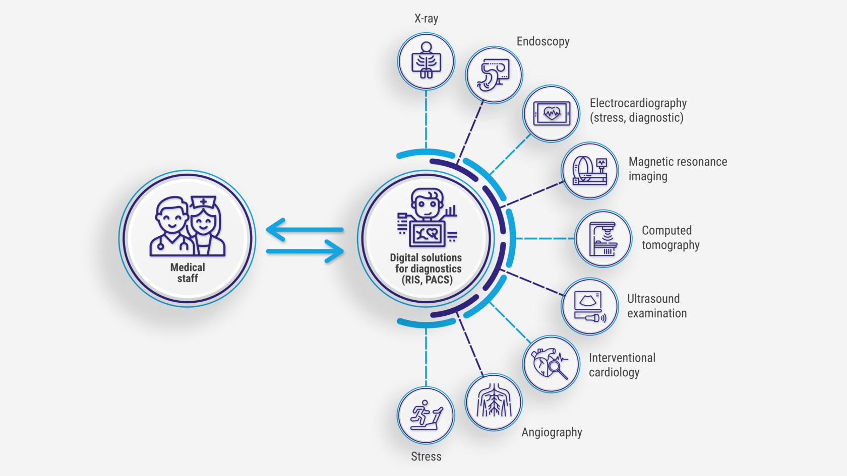 Activation and deactivation of operating modes via commands from the Medical Information System (MIS), receipt of orders in DICOM format, and storage of information in PACS.